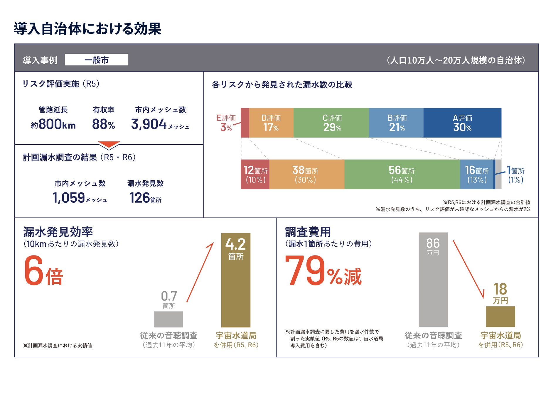 最も高いリスクを示すE評価エリア(図の赤いメッシュ)は全体のわずか3%の面積ながら、発見された漏水の10%(12箇所)を占めています。また、次に高リスクのD評価エリア(図のオレンジのメッシュ)は全体の17%の面積から、全漏水の30%(38箇所)が発見されました。つまり、E・D評価エリアを合わせた全体の20%のエリアから、全漏水の40%(50箇所)という高い割合の漏水が特定されたことになります。この結果は、漏水リスク診断の有効性を明確に示しており、特にE評価エリアを最優先に調査することで、限られた資源で最大の効果を得られることがわかります。