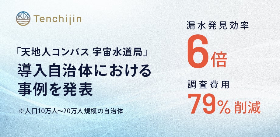 JAXA認定の宇宙ベンチャー 株式会社天地人(東京都中央区 代表取締役 櫻庭康人)は、衛星データを活用し持続可能な水道事業の実現を支援する水道DXソリューション「天地人コンパス 宇宙水道局」の導入自治体における事例を発表したことをお知らせいたします。人口10万人〜20万人規模の自治体で、漏水発見効率6倍、調査費用79%削減を実現しました。